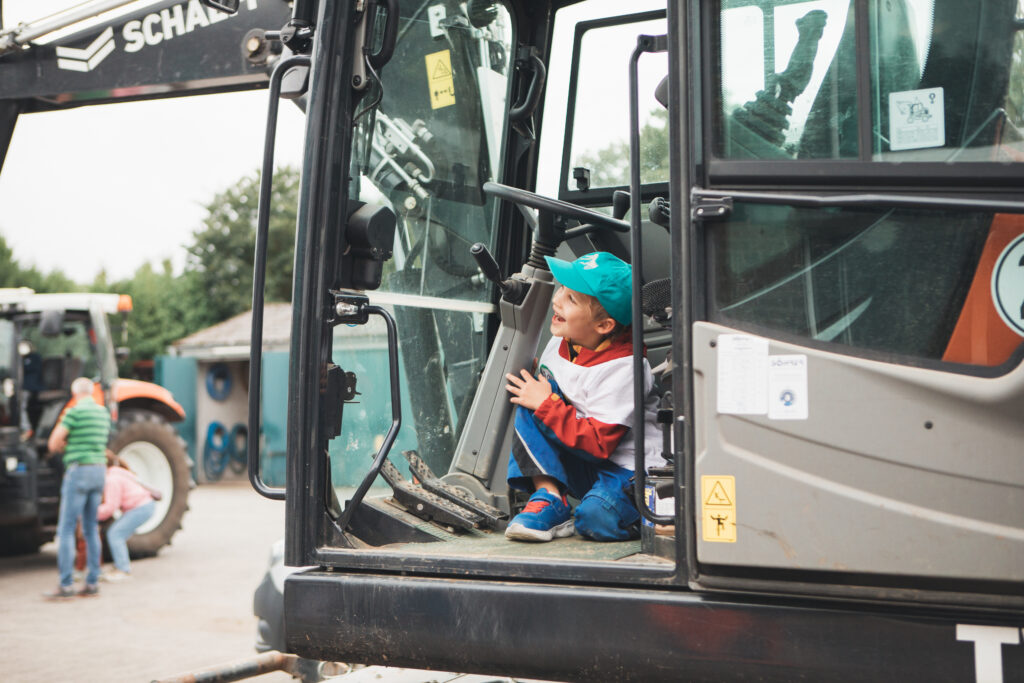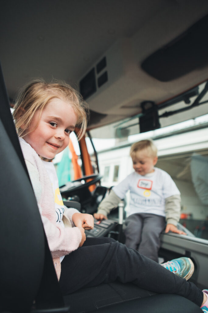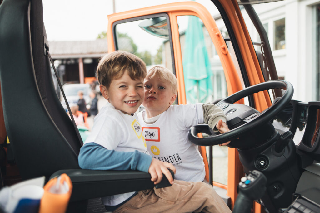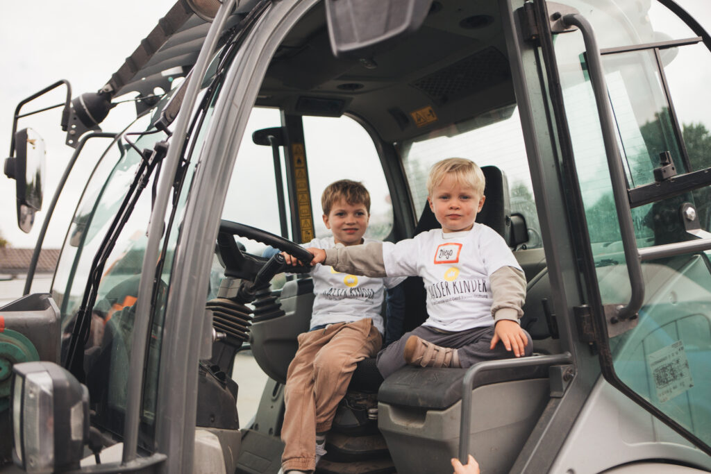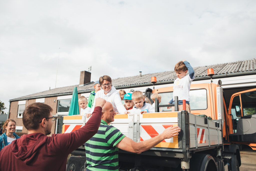 Bauamtsleiter Marco Römer und seine Kollegin Christel nahmen sich viel Zeit, um die zahlreichen Fahrzeuge und Geräte des Bauhofs vorzustellen. Ob Bagger, Unimog, Radlader oder Laubgebläse – die Kinder staunten über die eindrucksvollen Maschinen und erfuhren, wie sie im Alltag der Stadt eingesetzt werden.