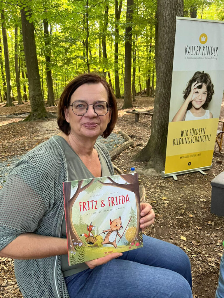 Lese- und Literaturpädagogin Claudia Lang las den Kindern unter anderem die mutmachende Geschichte über das Verlaufen im Wald „Fritz & Frieda – Ein Frischling kommt selten allein“ von Anna Böhm vor.