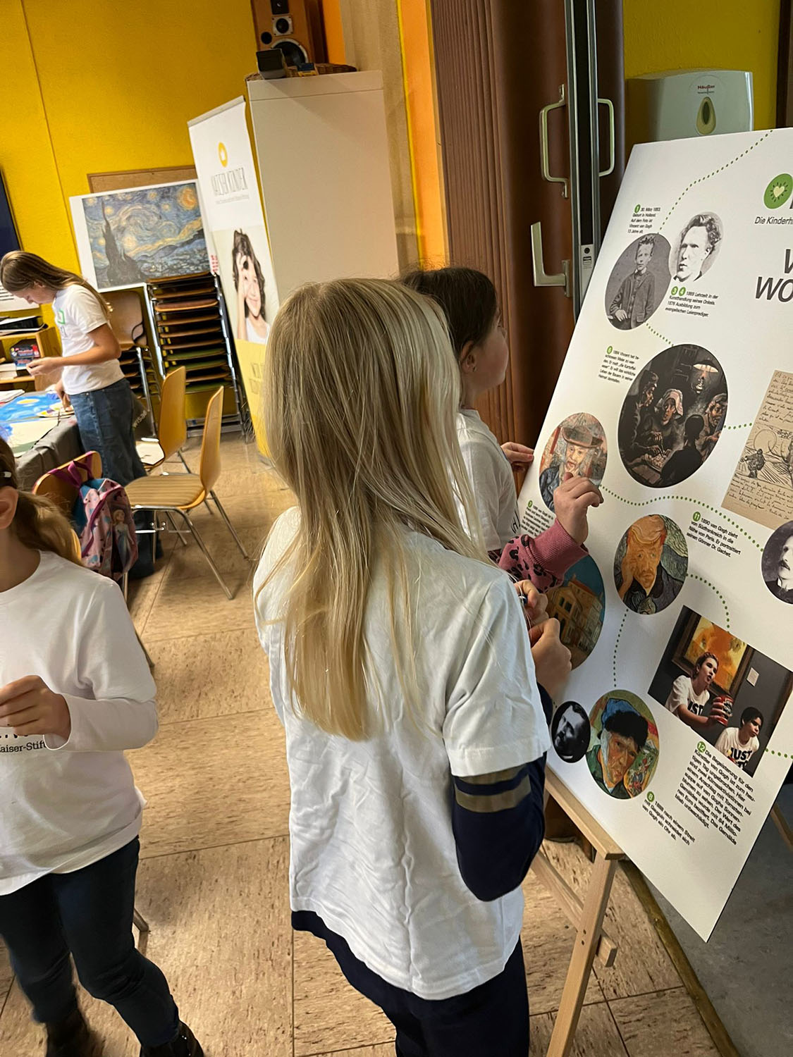 Im zweiten Teil des Workshops lernten die Kinder bei einem Quiz mit Annette Gรผmbel viel รผber das Leben van Goghs und die Bedeutung seiner Kunst. So konnten die Kinder einen guten Eindruck davon erhalten, welche Gefรผhle van Gogh in seinen Bildern ausdrรผcken wollte.