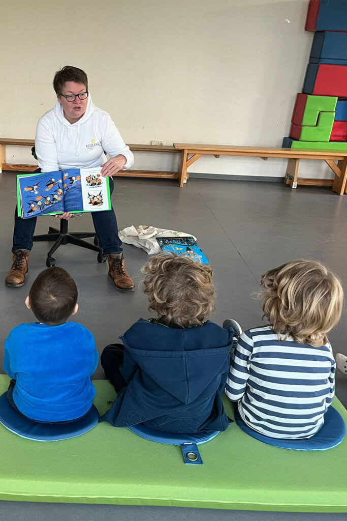 Lese- und Literaturpรคdagogin Claudia Lang las den Kindern unter anderem die mutmachende Geschichte รผber das Verlaufen im Wald โ€žFritz & Frieda – Ein Frischling kommt selten alleinโ€œ von Anna Bรถhm vor.